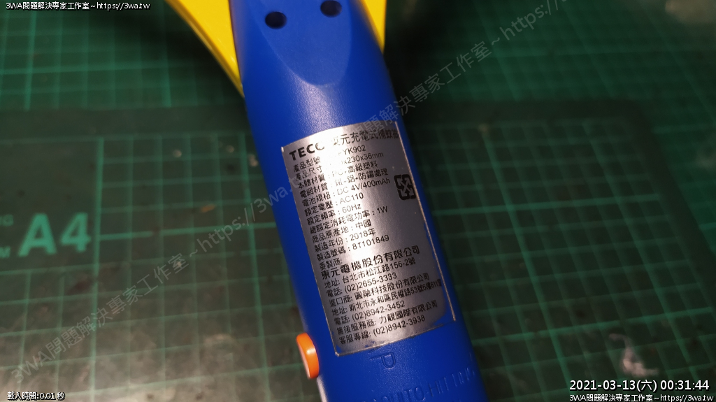 | 內容說明:2021.03.13電蚊拍更換鋰電池 | 瀏覽人數: 1222 |